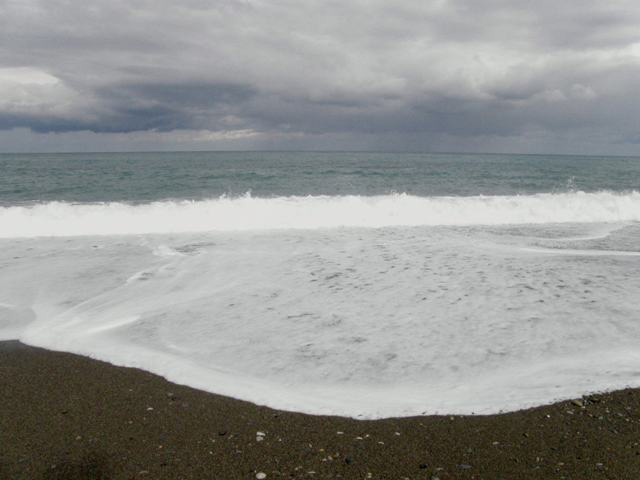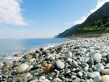 波打ち際を歩いての翡翠探査は大波に備えてのライフジャケットも必要。けれど波を避けて歩くのであれば運動靴やゴム長で十分。翡翠を得るのは難しくても海岸には美しい小石がたくさん落ちています