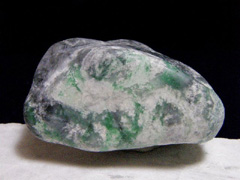 ヒスイ・ハンティングに行く前に「何が翡翠原石か?」を知っておくのは絶対に必要。それもインターネットで写真を見るだけというのではなく、本物翡翠原石に実際に触れることが大切です。ヒスイ海岸で拾える翡翠原石は全部が緑色のものなど滅多にありません。白色の地に緑の斑(ふ)が入ったり、全体が若草色に染まって、いかにも翡翠らしい原石も稀です。翡翠原石は白黒斑(まだら)のものや、くすんだ灰色のもの、緑と黒が斑(ぶち)になったものなど千差万別。とにもかくにもたくさんの原石に触れることが翡翠の鑑別眼を養う唯一の方法です。