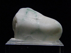 もっとも基本的なヒスイ・ハンティングは波打ち際で、波が運んできた白っぽい石を、波に濡れないように注意しながら拾います。地元のヒスイハンターにコツを尋ねて、「白く輝く原石を探して、石を乾かして陽光にかざして、味の素の結晶のようにキラキラと光る部分のあるものを選んでいる」と教わったことがあります。その人に見せてもらった浜からあがったばかりの翡翠原石は、親指大で全体に白く、3分の1ほど明るい緑が混じっていて、陽光にかざすと、緑はいっそう美しく輝いて、海神の贈り物なのだと納得できるほど見事でした。
