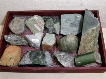 翡翠類似石としてのロジン岩やピンクヒスイ、ゾイサイトなどを入れたコレクション・ボックス。用意した本人にも翡翠なのか類似鉱物なのか、区分けつきかねる原石が入っています