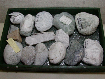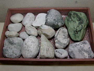 このボックスはおもに世界各地のネフライト原石。ネフライトは日本では軟玉翡翠とさげすまれていますが、古代中国では玉(ぎょく)の王者ととうとばれた宝石。糸魚川地方での産出はとてもありがたいことなのです