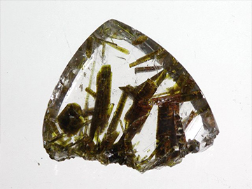 パキスタン産水晶に内包されたエピドート。グリーンルチルのなかにはエピドートが内包されているものがある