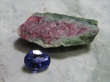 ゾイサイトの藍色をした結晶がタンザナイト。天界の色合いに魅入られてしまう人が多い