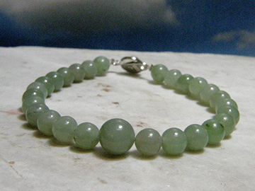 姫川産のネフライト原石から制作した6mm玉ブレスレット。このように色合いが薄く透明度が高い国産ネフライトは貴重です