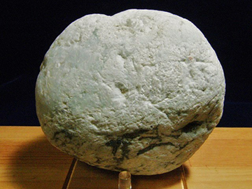 長崎県は日本中に10ヶ所ほどある翡翠発見地のひとつ。この産地のネフライトには貝が開けた穴のあるものがあります。写真の標本は255g, 約100x73x27mm