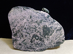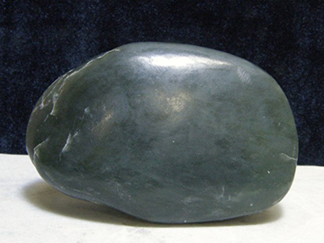 (3)姫川産ネフライトは濃緑色のほかに濃紺混じりや黒色など、いろいろな色合いのものがあります。写真は切断片で1097g,約107x100x48mm