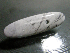 ◆翡翠大珠(ひすいたいしゅ)は日本翡翠ファンには耳慣れた言葉であっても、世間的な認知度は低いままです。翡翠大珠はいまから5千年ほど前の縄文時代中期に始まって後期にかけてのおよそ2千年間の遺跡から出土する翡翠製品。きわだって優美なものは細長い楕円形、多くは5-15センチ前後、中央よりの位置に紐を通したと推測される孔があいていて、原始時代の産物とは思えないほどモダンな形をしています。現在のところ、これが何に使われたのか、社会的にどのような意義があったのか、まったくわかっていません。