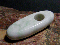 (3)ロシア産翡翠で製作した大珠。縄文の大珠の孔は中空の竹の管に砂の研磨剤をつけて錐揉みしながら開けたと考えられている。孔に呪術的な意味があったように思える