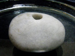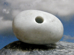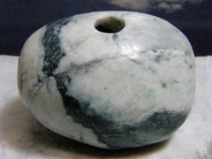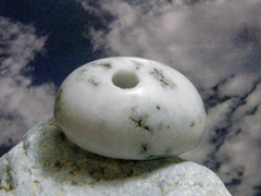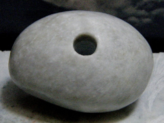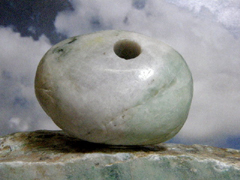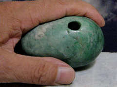 日本翡翠大珠のギョロメ・バージョン。大きな目は「魔」を睨んで寄せつけない。くっきりとした孔は彼岸のパワーを汲み出す井戸。ここらあたりに翡翠大珠の謎をとくカギがあるようだ