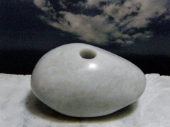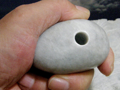 ◆翡翠石笛はほぼ鶏卵の大きさ。直径10ミリ、深さ30ミリの孔がひとつ開けられています。この孔を下唇で3分の2ほどふさぎ、残りの隙間に細く長く息を吹きいれると、ピーッと鋭い音がします。尺八を吹くように練習すると音階を表現できるようになるそうです。鶏卵大の石笛は滑らかに磨かれていて、手のひらにすっぽりと納まります。その感触を楽しんでいると天の神さまからの贈り物のように思えてきます。