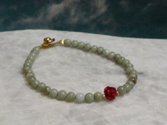 日本翡翠4ミリ・ビーズの中央を飾るのは珊瑚のバラ。紐のように細くてエレガントなブレスレット