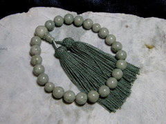 姫川産草色翡翠の12ミリ玉で組んだ念珠。珍しさから評価するなら白色系の日本翡翠よりはるかに貴重